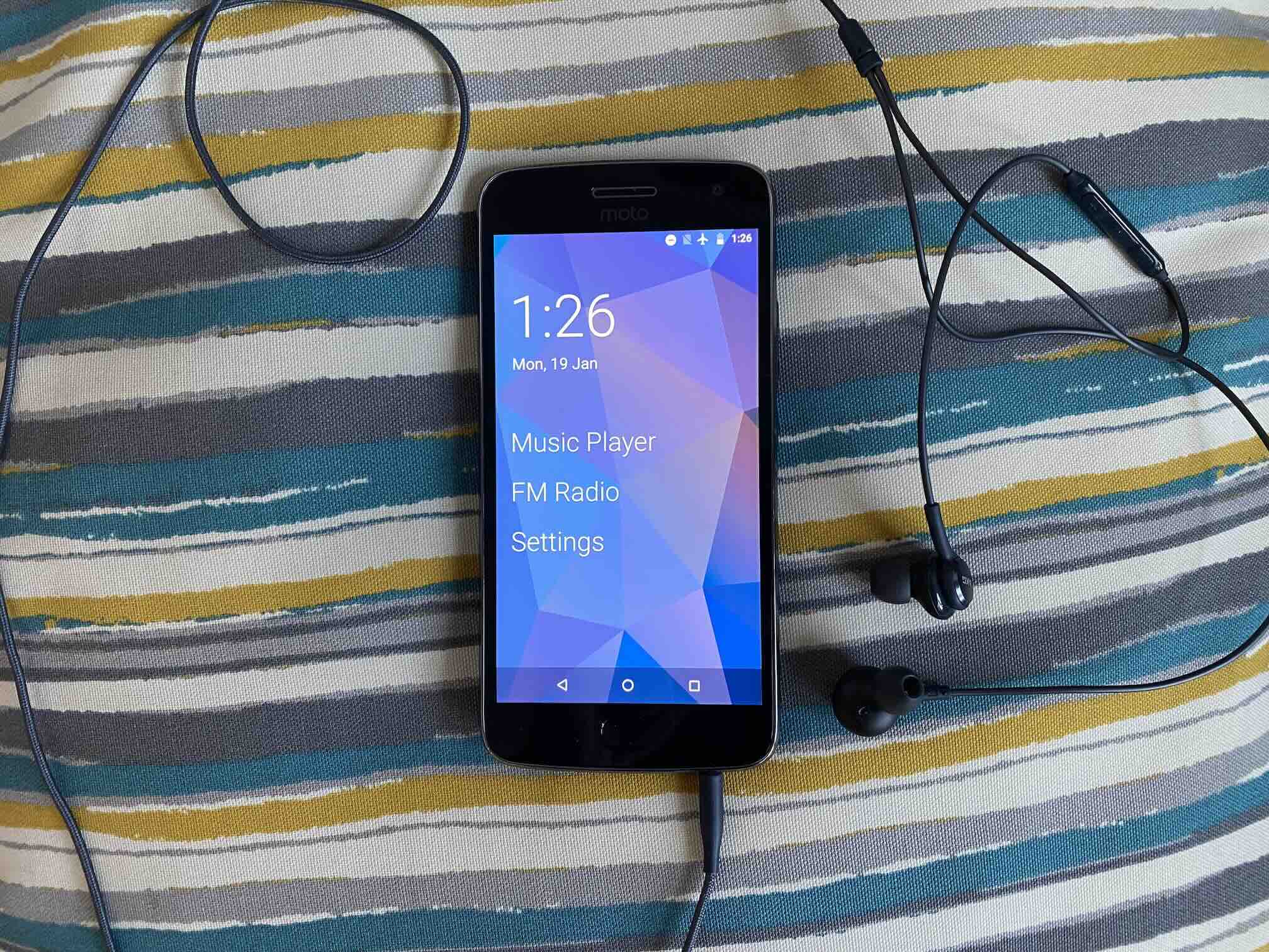There were a lot of options for music playing apps, but so far I’m happy with with my choice of Fossify Music Player. It’s completely offline and the interface is really straight-forward. I replaced the built-in Google keyboard with Heliboard to ensure that no part of Google’s internet-connected services would be invoked. The last app is the pre-installed FM Radio app from Motorola. It’s already good enough for anything I need. It automatically scans for stations, lets me save my favorite stations, and I can add labels to my saved stations.