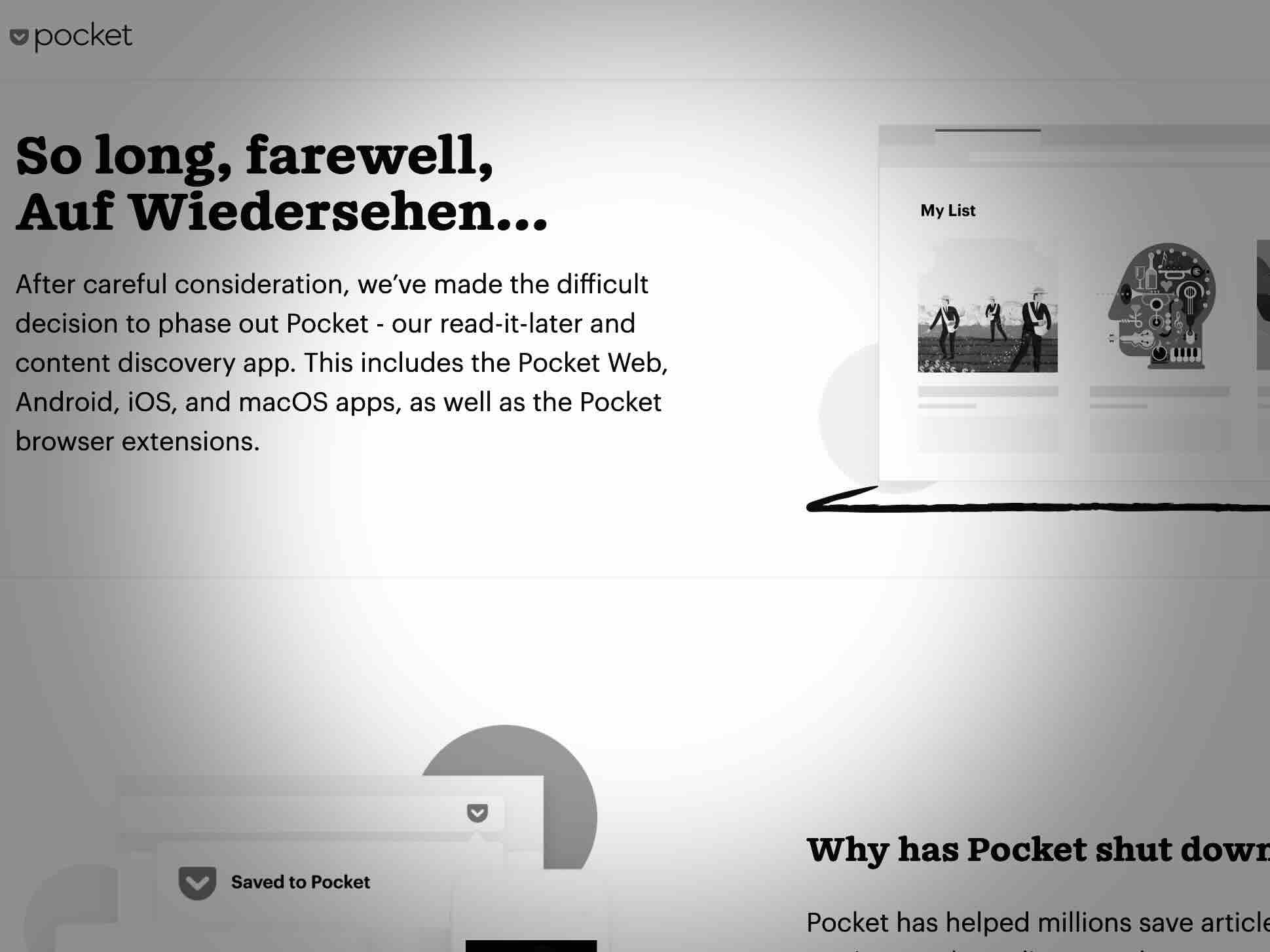 I used Pocket steadily ever since. Admittedly, a read-later service is at least partially a place I put things that I’ll never read. I read around 20-40% while the remainder is pushed down the unread stack, becoming a museum of things I wish I had the intellectual curiosity to care about. Nevertheless, it’s valuable to have a priveleged group of web links, especially ones that are cleaned up and easy to read. It was a nice addition to my tools for consuming the web. And then this past July, Mozilla shut it down for good.